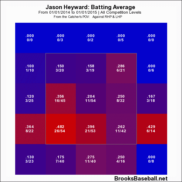So he is swinging less but also hitting for less power. According to ESPN’s Home Run Tracker, Heyward’s average distance per home run was 394.2 feet last season with an average speed of 102.6 MPH off the bat. I find it hard to believe that he has peaked at only 25 but the Braves have decided to move him within a year of free agency. This will be a very big season to determine what Heyward’s value for fantasy is going forward. Here is Heyward’s spray chart and zone profile from 2014, one of the reasons I have not given up hope just yet: