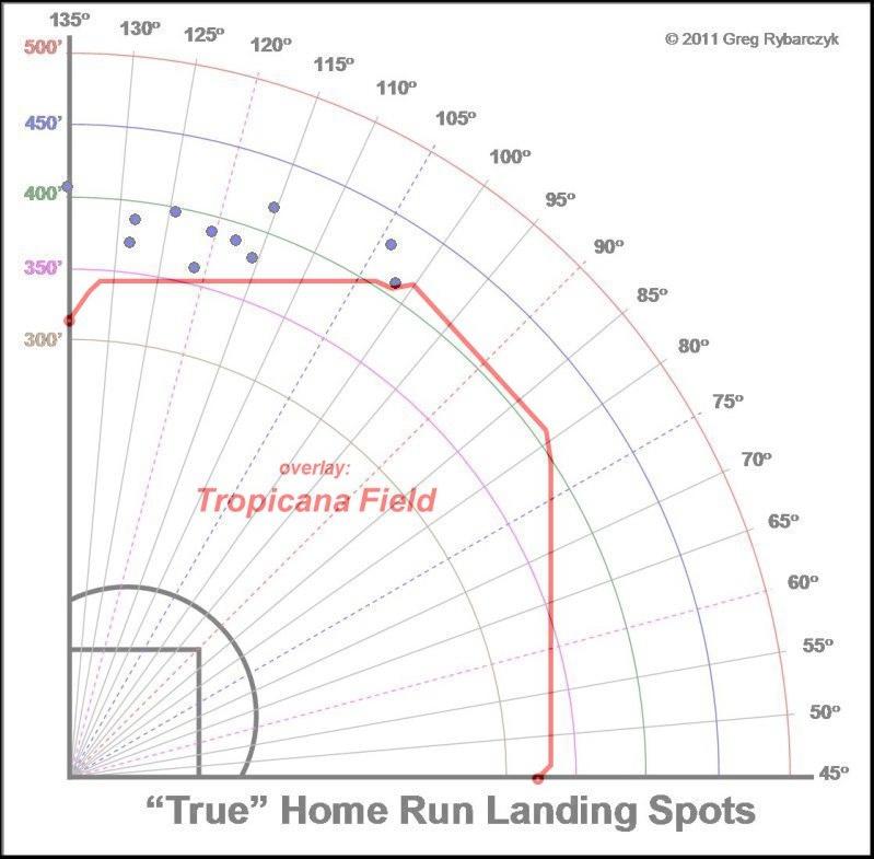 The Rays very rarely had a great hitting catcher during the Joe Maddon regime. Rather, a veteran who could handle the pitching staff and throw out baserunners. Rivera is not only a highly regarded defensive backstop, he also has some pop. He has thrown out 39% of base stealers (league average 28%) over the course of his career. Pair that with his 11 home runs and .252/.319/.432 slash line last year and he is a huge offensive upgrade to the Rays without sacrificing defense. Here is Rivera’s home run overlay with Tropicana Field as the backdrop: