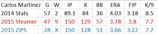 My 2015 Carlos Martinez Projection: 12 W, 175 IP, 158/43 K/BB, 3.72 ERA, 1.28 WHIP, 8.1 K/9