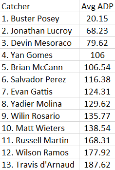 Following up on my article about the NFBC’s top 200 by ADP, I will list the catchers taken in the top 200 along with their average draft position in the chart: