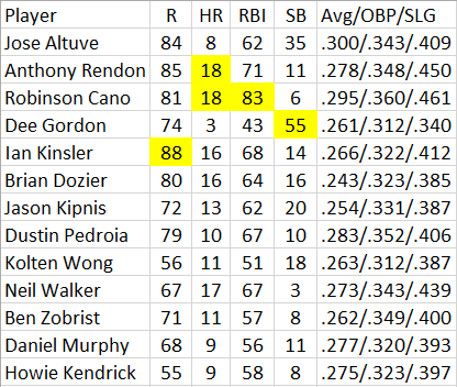 In the midst of thinking that middle infield would be a tough position to forecast in 2014, three middle infielders made the top 20 on ESPN’s Player Rater. However, it did not include top-twelve selections Robinson Cano, Troy Tulowitzki or Hanley Ramirez. This seems to be carrying over to early ADP’s as people are reacting to the strong performances by Jose Altuve and Anthony Rendon who finished 1st and 17th respectively last season. Early on, each player is being taken in the top 15 in NFBC money drafts. The third player to finish in this company was Dee Gordon, who is not enjoying the early love as his other brethren due to questions of regression. But is Gordon really that much more of a question mark than the other two? That remains to be seen. At first glance, second base seems much deeper than in the past.