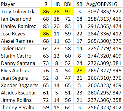 Intriguing undrafted shortstops include Erick Aybar, Chris Owings and Alcides Escobar. I can see a bounce back by Jean Segura who endured a very tough season not only in his adjustments, but personally as well. Danny Santana is due to regress but how much? If he can steal 20 bases and score 80 runs then he still has value. Yes his average will drop to the .270 range but it depends on need. Javier Baez will be a very tough player to own since he will be streaky and may not break out until the second half. I think he is talented but to reach for him at pick 106 would be unwise. There are options if you do your research, just do not wait too long or you will find yourself with Jed Lowrie.