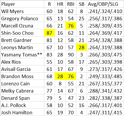 With health, it is hard to imagine a prohibitive top twenty outfielder in 2014 draft preps has fallen so precipitously, but Choo has. How many owners did he upset? In NFBC formats this means he is a tenth round pick and chance well worth taking. Unless the curse of Kinsler is real.