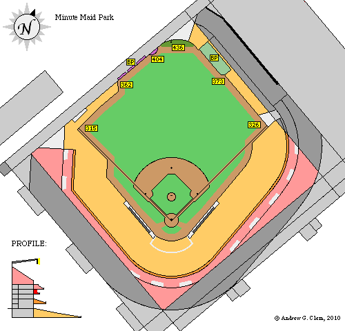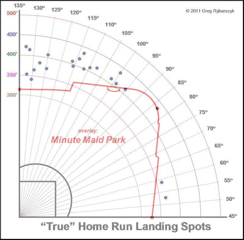 Observing the overlay is nice but here is a picture of Minute Maid with the dimensions displayed with the distances of the fences along with the knowledge of how far an average fly ball by Gattis travels: